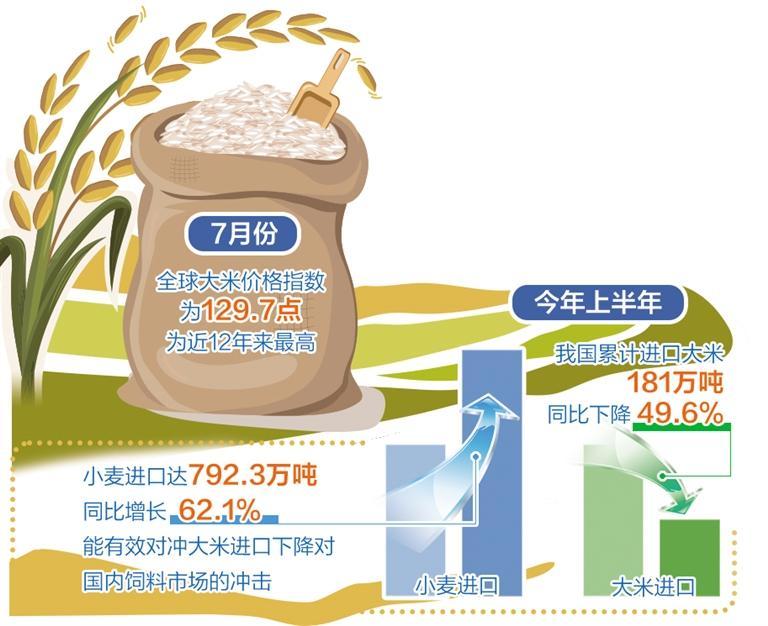 “為了確保大米進口穩(wěn)定性,我國各類進口主體也在推進大米進口多元化,避免來源地和品種過于集中帶來的進口安全風險。”彭超說。一方面,推進大米進口來源地多元化。我國大米進口來源地包括越南、緬甸、泰國、印度、巴基斯坦、柬埔寨等主產國。從去年10月起,我國開始逐步減少印度碎米進口,印度已從過去幾年中國最大的大米供應商滑落至第四位。另一方面,推進糧食進口品種多元化。減少大米進口的同時,增加飼用小麥進口。今年上半年,我國小麥進口量達到792.3萬噸,較去年同期增長62.1%,能夠有效對沖大米進口下降對國內飼料市場的沖擊。