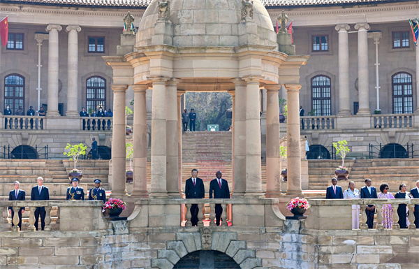 8月的比勒陀利亞,晴空萬里,惠風(fēng)和暢。總統(tǒng)府廣場鮮花盛開,中南兩國國旗迎風(fēng)飄揚。在總統(tǒng)摩托車隊護衛(wèi)下,習(xí)近平乘車抵達總統(tǒng)府,拉馬福薩在下車處熱情迎接。兩國元首登上檢閱臺。儀仗隊行持槍禮,軍樂隊奏中南兩國國歌,現(xiàn)場鳴放21響禮炮。習(xí)近平檢閱南非儀仗隊。兩國元首同雙方陪同人員一一握手。