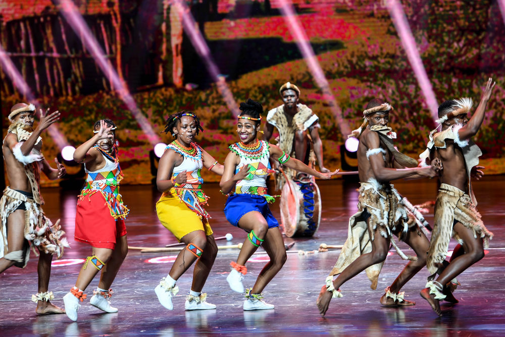 來(lái)自南非的演員在中國(guó)內(nèi)蒙古呼和浩特市舉行的第十一屆中國(guó)國(guó)際民間藝術(shù)節(jié)上表演《祖魯歌舞》(2019年8月23日攝)。