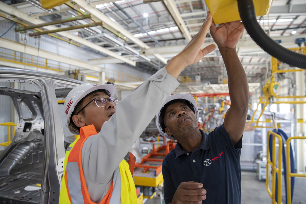 在南非東開(kāi)普省北汽南非工廠,南非員工邦加尼(右)與中國(guó)同事方龍一起工作(2023年5月9日攝)。2022年,中國(guó)汽車(chē)品牌在南非的銷(xiāo)量突破3.5萬(wàn)臺(tái),2023年預(yù)計(jì)將突破4萬(wàn)臺(tái)。