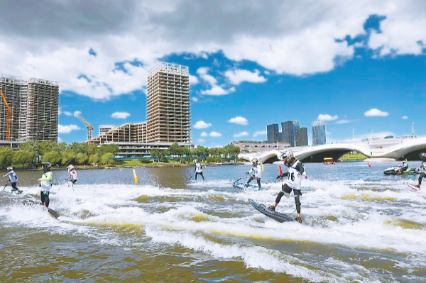 今年7月,2023年全國電動沖浪板聯(lián)賽(北京大運河站)在北運河開賽,這也是副中心在大運河首次承辦國家級動力板聯(lián)賽?;顒蝇F(xiàn)場,參賽運動員在風景如畫的大運河上踏浪飛馳,吶喊聲、歡呼聲在河兩岸此起彼伏,飛濺的浪花、激情的運動、歡樂的人群,共同構(gòu)成了一幅炫彩、活力的運河新圖景。