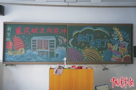 8月21日,北京市房山區(qū)石樓中學(xué)、夏村中學(xué)的師生一起畫出迎接開學(xué)的黑板報(bào)。張藝/攝