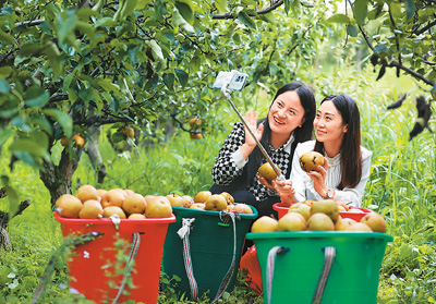 網(wǎng)紅主播在貴州省黔西市金碧鎮(zhèn)鏵口寨社區(qū)梨子基地,幫助村民直播銷售梨子。周訓超攝(人民圖片)