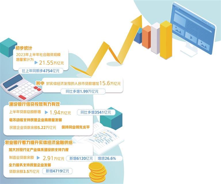 今年上半年以來,金融持續(xù)支持實體經濟恢復發(fā)展和回升向好,金融體系對實體經濟的支持進一步加大。初步統(tǒng)計,2023年上半年社會融資規(guī)模增量累計為21.55萬億元,比上年同期多4754億元。其中,對實體經濟發(fā)放的人民幣貸款增加15.6萬億元,同比多增1.99萬億元。