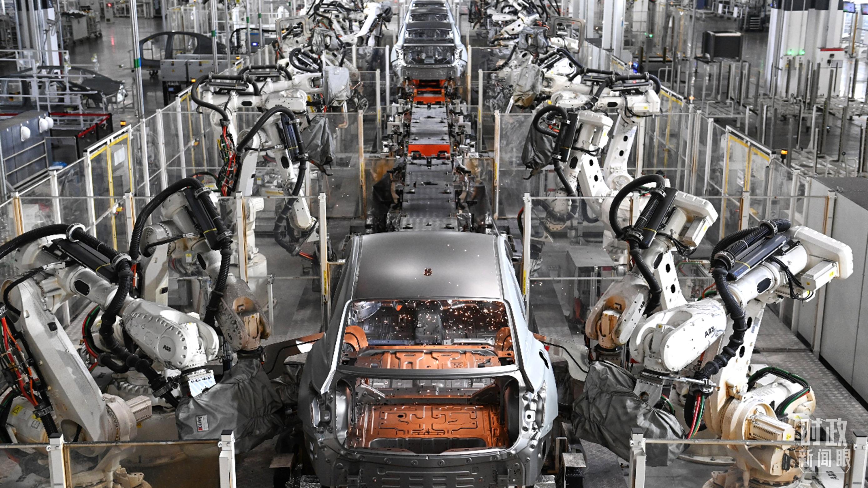 △中國一汽紅旗制造中心,全自動機(jī)械手臂正在進(jìn)行車體焊裝。(圖/視覺中國)