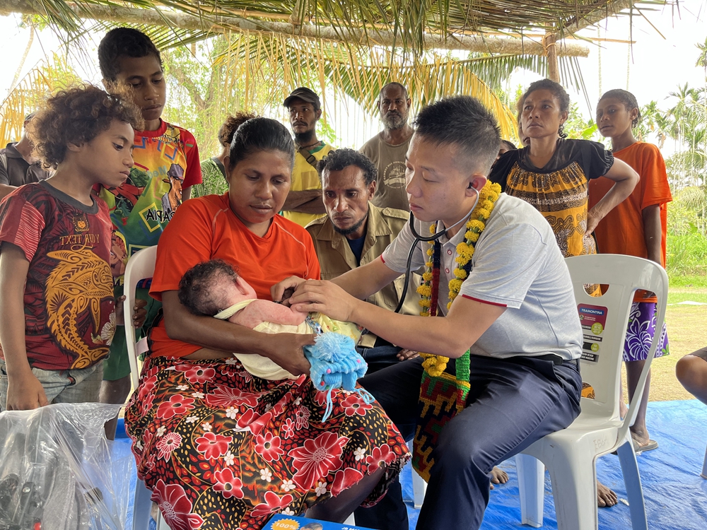 2023年8月5日,在巴布亞新幾內(nèi)亞中央省的一個村莊里,第12批援巴新中國醫(yī)療隊副隊長、新生兒科副主任醫(yī)師劉振球為當?shù)貗雰郝犜\檢查。新華社發(fā)(第12批援巴新中國醫(yī)療隊供圖)