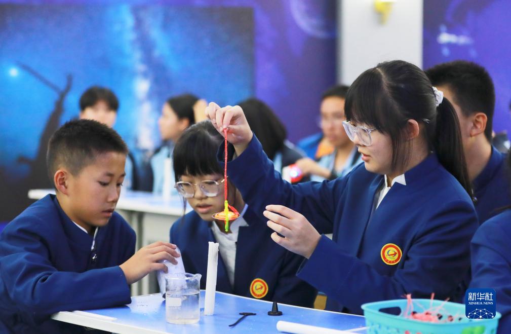 9月21日,在內(nèi)蒙古阿拉善盟額濟納旗,學生在做趣味實驗。新華社發(fā)(敖琪 攝)