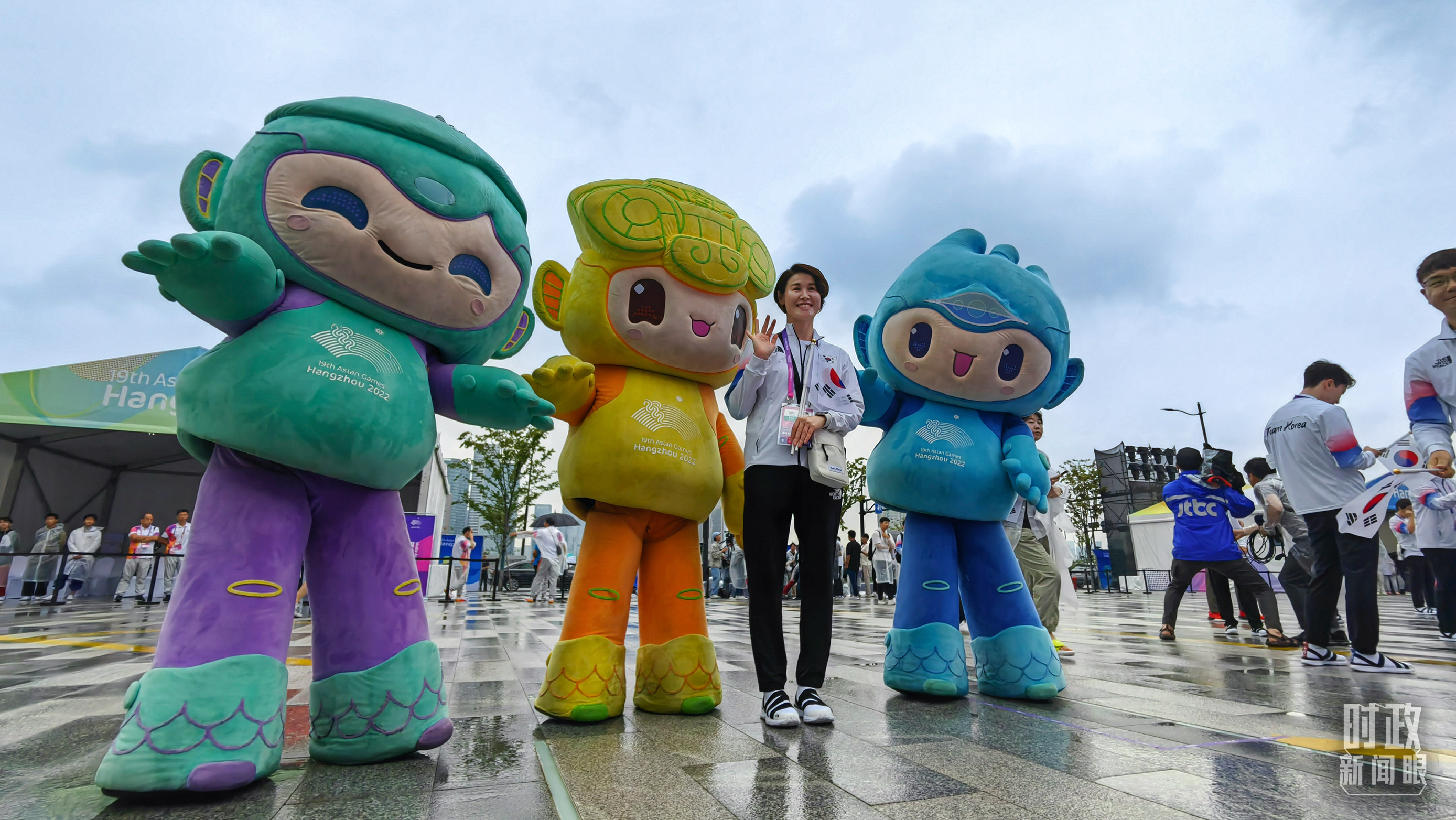 △亞運(yùn)村為各代表團(tuán)舉行歡迎儀式,隊(duì)員們紛紛與吉祥物"蓮蓮"、"琮琮"、"宸宸"合影。(總臺(tái)央視記者陳偉奎拍攝)