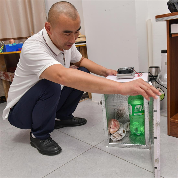 只有初中文憑的楊波就開始學習冰箱知識,了解冰箱原理結(jié)構(gòu):為什么會制冷還能調(diào)節(jié)溫度?等等,做到了了然于胸,又購買了冷卻片、制冷片、散熱片、風扇、溫度計、封條等必備用料,自己又在工地找到了廢棄的塑膠板,在家具店里找來隔熱錫紙,經(jīng)過一番折騰,一臺高60 厘米、寬40厘米、厚40厘米的手工小冰箱做成功了。使用2個月來,最低溫度可達2攝氏度。效果非常好!