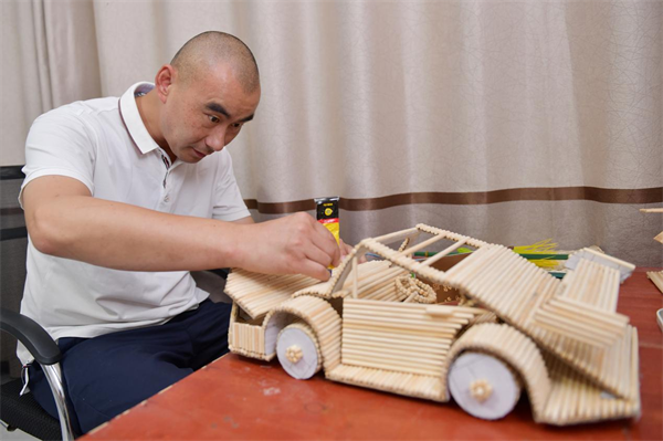 編制了一段時間的小手鏈、小掛件、小燈籠等等小工藝品后,楊波購買了一次性筷子自己做了一個煙盒。這個煙盒只要一按按鈕,煙支就會自動彈出,而且煙嘴朝上。隨后,楊波又購買了許多一次性筷子,做一輛轎車模型,不曾想,等到了安裝擋風玻璃時,小轎車散架了。分析原因,是因為圓柱狀筷子之間的粘和面積太小不牢靠。楊波找了一些紙板當墊板,使筷子的粘和面變成2處,牢固程度提高1倍,前前后后有10多天,一輛筷子車模做成功了。