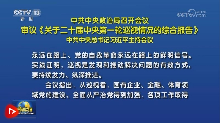 會(huì)議認(rèn)為,以習(xí)近平同志為核心的黨中央高度重視巡視工作,把巡視作為推進(jìn)黨的自我革命、全面從嚴(yán)治黨的戰(zhàn)略性制度安排,作出一系列重大決策部署。二十屆中央第一輪巡視堅(jiān)持守正創(chuàng)新,推進(jìn)政治監(jiān)督具體化、精準(zhǔn)化、常態(tài)化,釋放了全面從嚴(yán)治黨永遠(yuǎn)在路上、黨的自我革命永遠(yuǎn)在路上的鮮明信號(hào)。實(shí)踐證明,巡視是發(fā)現(xiàn)和推動(dòng)解決問(wèn)題的有效方式,要持續(xù)發(fā)力、縱深推進(jìn)。