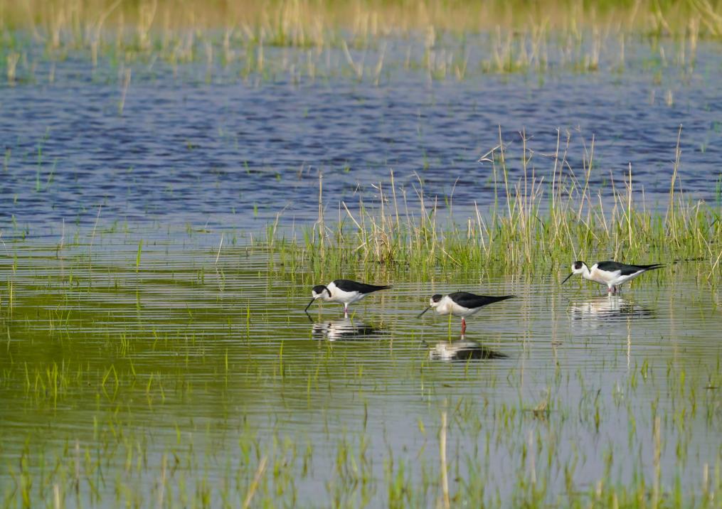 水鳥在蓑衣樊村附近的濕地棲息覓食。(新華社記者邵琨攝)