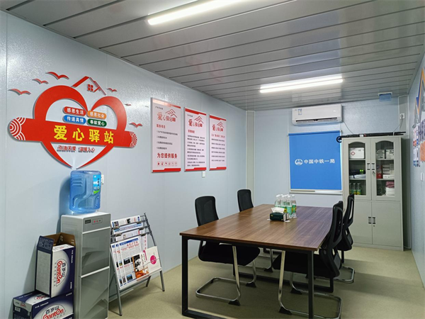 服務(wù)站門口即是S312省道,距離轉(zhuǎn)體梁主要施工工點(diǎn)不足500米,步行8到10分鐘可達(dá)。服務(wù)對象包括勞動工人、環(huán)衛(wèi)綠化工人、市政維修工人等戶外勞動者。站點(diǎn)內(nèi)溫暖明亮,空調(diào)和飲水機(jī)的冷熱水24小時提供便利,雨傘架、充電站解決燃眉之急。急救藥箱內(nèi)含有退燒貼和暖貼,感冒消炎、消毒止血常備藥以供不時之需,除此之外還增設(shè)特色閱讀區(qū),各類書籍、月刊、報(bào)紙可供勞動者休息時閱讀放松,并由工作人員定期更新。
