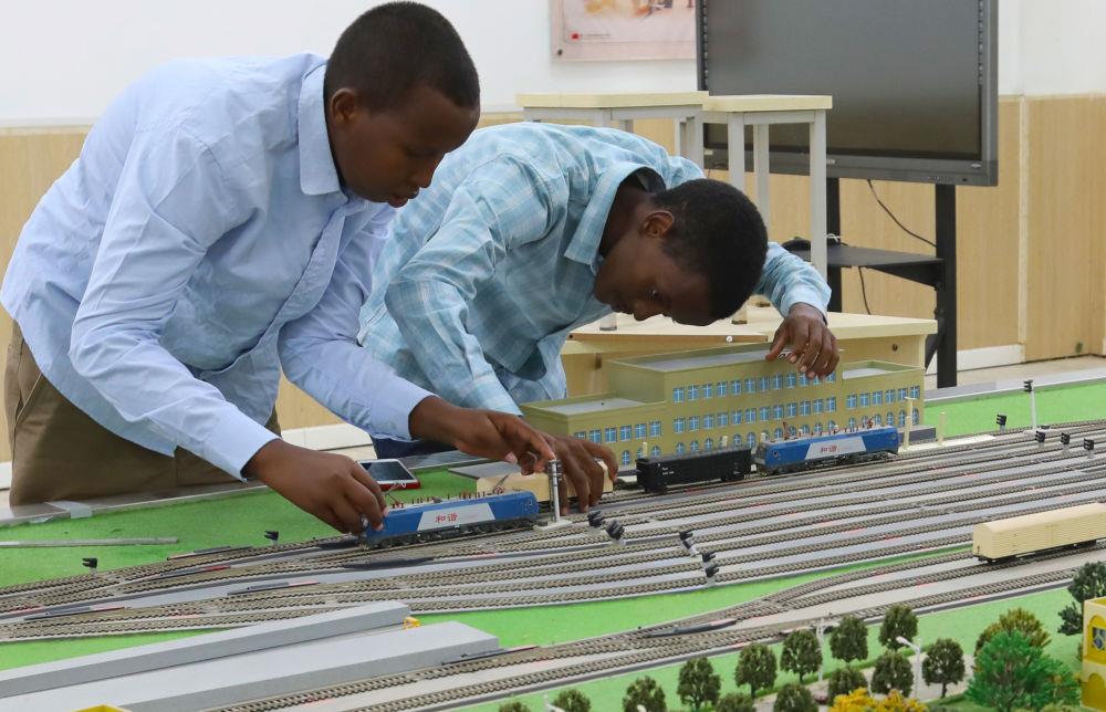 △2022年9月19日,在位于吉布提首都吉布提市的工商學(xué)校,學(xué)生在魯班工坊鐵道運(yùn)營(yíng)沙盤(pán)教學(xué)區(qū)學(xué)習(xí)。