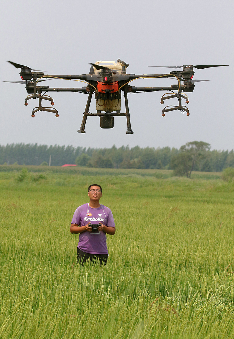 2021年7月27日,哈爾濱呼蘭區(qū)腰堡村的一片稻田間,忠萍農(nóng)作物種植專業(yè)合作社的“飛手”正在操縱無人機(jī)對水稻噴施葉面肥。