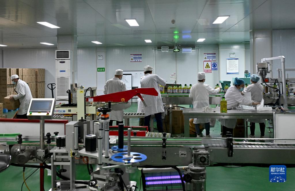 11月4日,在阿拉山口綜合保稅區(qū)內(nèi)的阿拉山口金牧生物科技有限公司,工作人員在包裝亞麻籽油。新華社記者 趙晨捷 攝