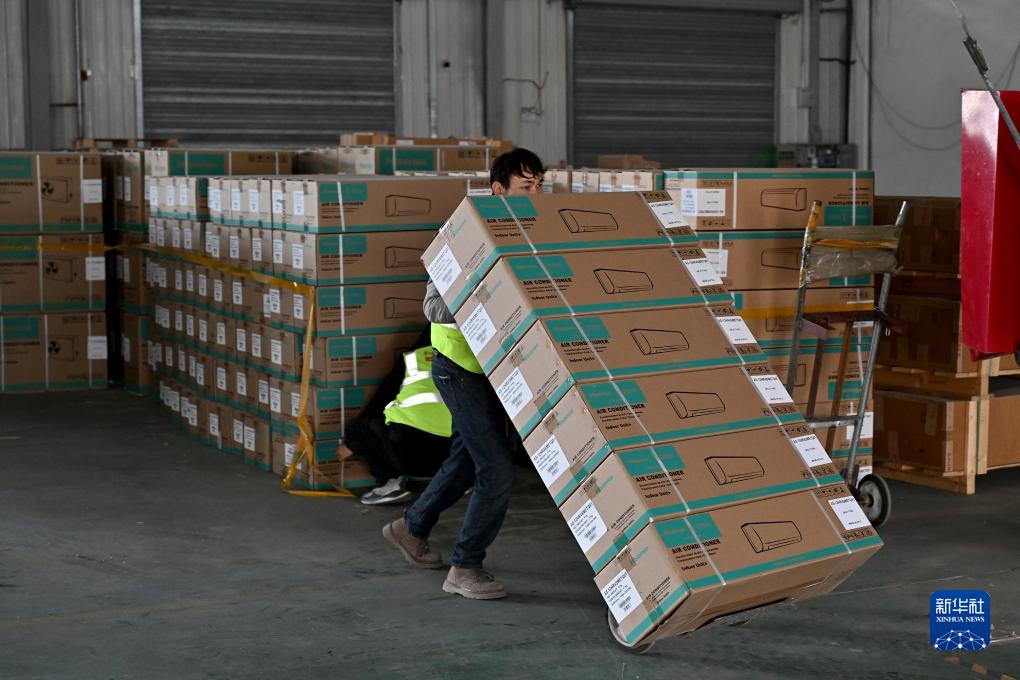 11月4日,在阿拉山口綜合保稅區(qū)內(nèi)的跨境電子商務(wù)分揀清關(guān)中心,工作人員將國產(chǎn)空調(diào)裝車準(zhǔn)備運往國外。新華社記者 李鑫 攝