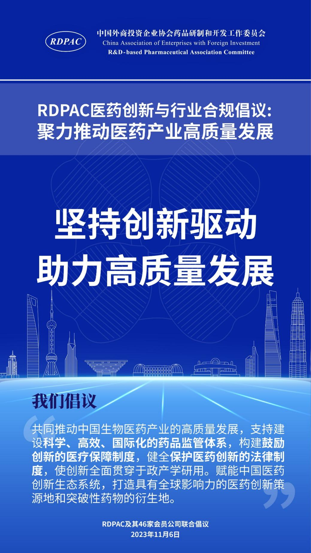 11月6日,中國外商投資企業(yè)協(xié)會藥品研制和開發(fā)工作委員會 (以下簡稱 “RDPAC”)及其成員公司在華負(fù)責(zé)人共同發(fā)起“RDPAC醫(yī)藥創(chuàng)新與行業(yè)合規(guī)倡議”,致力于打造充滿活力的醫(yī)藥創(chuàng)新生態(tài)系統(tǒng)、完善的行業(yè)合規(guī)體系,聚力推動中國醫(yī)藥產(chǎn)業(yè)的高質(zhì)量發(fā)展,建設(shè)健康中國。