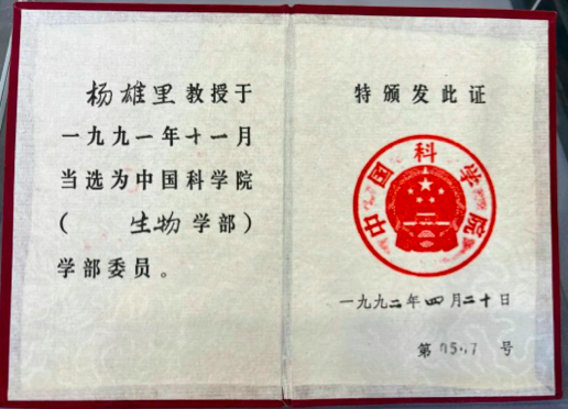 證書左側(cè)頁(yè)上寫著:“楊雄里教授于1991年11月當(dāng)選為中國(guó)科學(xué)院生物學(xué)部委員。”這里所說(shuō)的學(xué)部委員就是現(xiàn)在我們熟知的中國(guó)科學(xué)院院士。