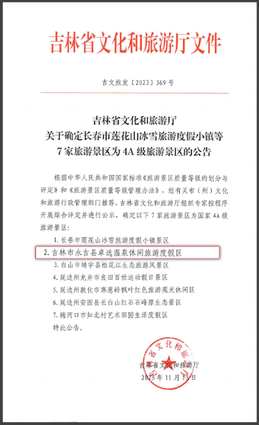近日, 根據(jù)國(guó)家《旅游景區(qū)質(zhì)量等級(jí)的劃分與評(píng)定》和《旅游景區(qū)質(zhì)量等級(jí)管理辦法》,經(jīng)相關(guān)部門推薦,吉林省文化和旅游廳組織專家按程序開展綜合評(píng)定并進(jìn)行公示,確定金恪集團(tuán)旗下吉林卓遠(yuǎn)溫泉休閑旅游度假區(qū)等7家旅游景區(qū)成為國(guó)家4A級(jí)旅游景區(qū)。