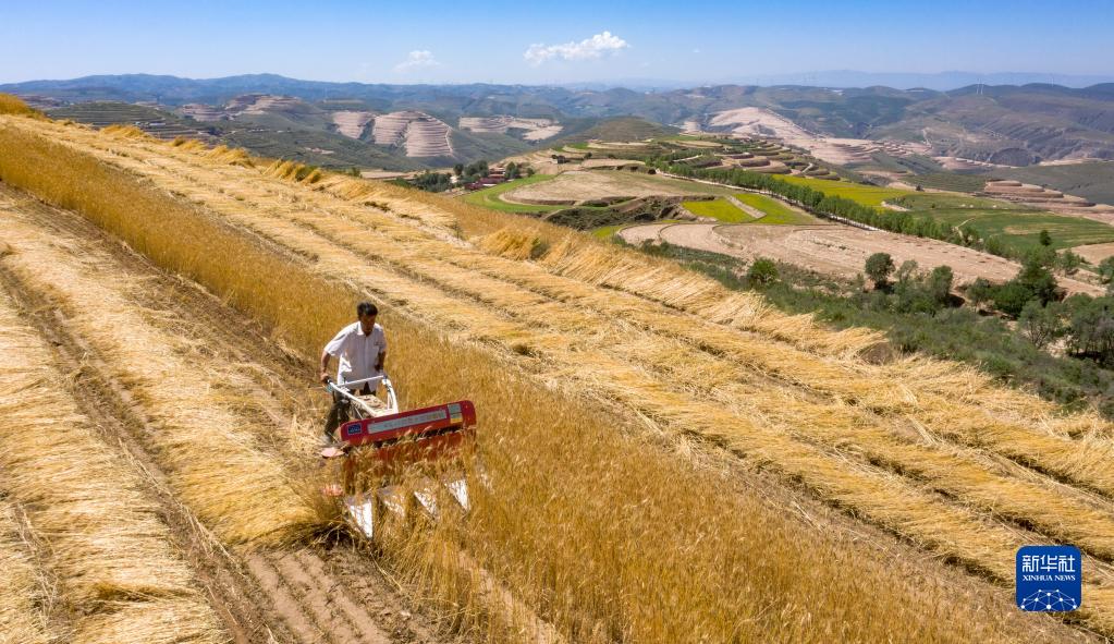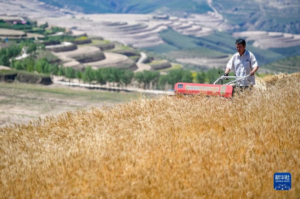 近日,寧夏西海固地區(qū)種植的冬小麥陸續(xù)進入收割季節(jié)。旱塬、梯田上一片金黃,農民操作著收割機械在其中忙碌。據了解,今年固原市夏糧面積42.89萬畝,其中冬小麥36.04萬畝。