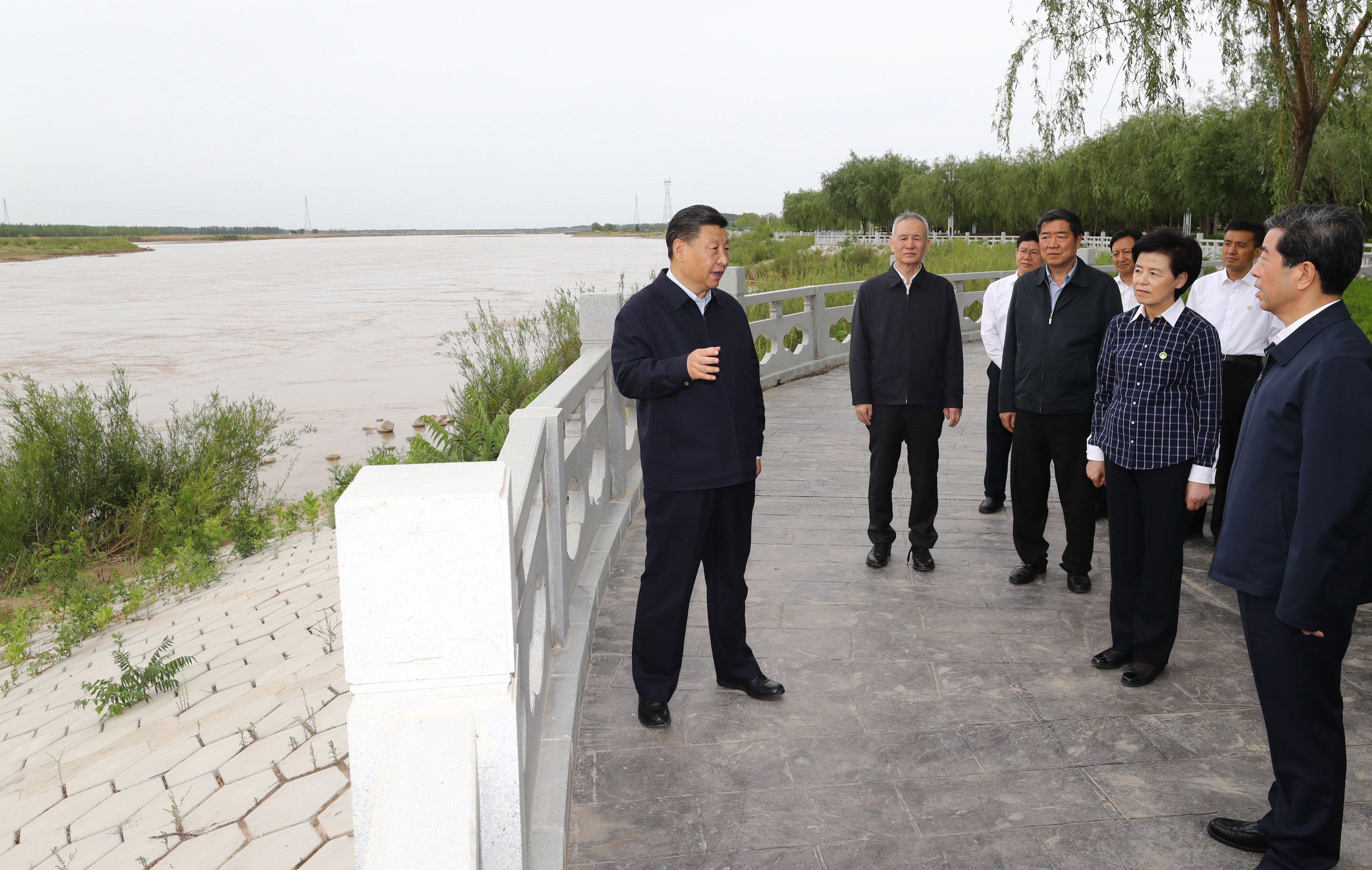 2020年6月8日,習(xí)近平在寧夏黃河吳忠濱河大道古城灣砌護(hù)段,察看黃河生態(tài)治理保護(hù)狀況。