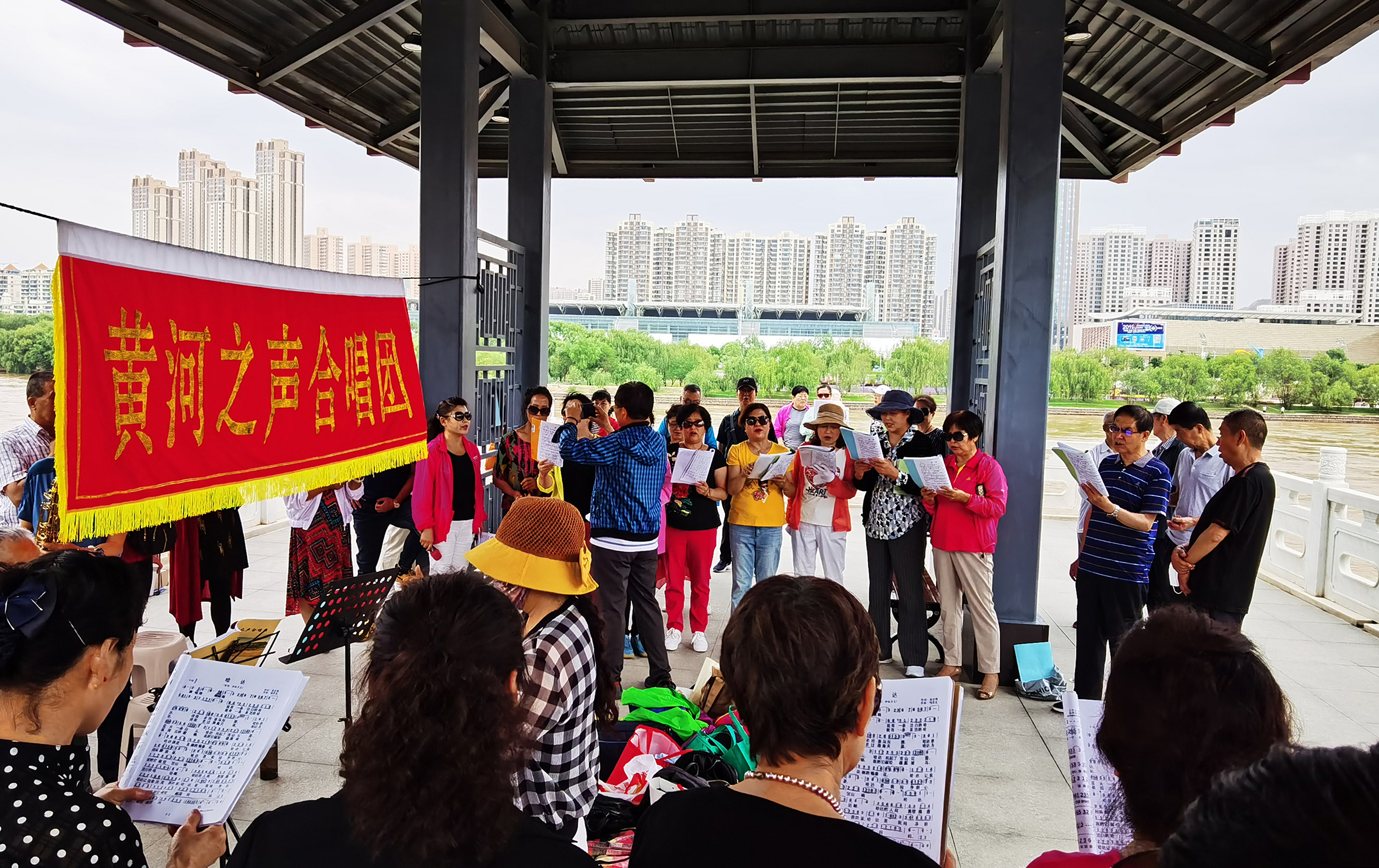 在蘭州市城關(guān)區(qū)黃河治理蘭鐵泵站項目點,黃河之聲合唱團(tuán)開展合唱活動(2020年6月15日攝)。