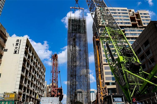 作為最能說(shuō)明項(xiàng)目部可以在“瓷器店里打老鼠”的施工,就是維也納酒店門(mén)前下放地下連續(xù)墻鋼筋籠。大家知道,車(chē)站的地連墻是保證地鐵車(chē)站安全的基礎(chǔ)和關(guān)鍵。如前所述,深圳地鐵11號(hào)線中大八院站是在窄小空間里“舞刀弄棒”,而南翼的維也納酒店門(mén)廳檐角在空間侵入地連墻,導(dǎo)致有4幅地連墻無(wú)法正常施工。項(xiàng)目部以?shī)溟W為首的管理團(tuán)隊(duì),組織技術(shù)骨干,反復(fù)研討、比選方案,確定采用“低凈空成槽設(shè)備成槽,鋼筋籠分片槽內(nèi)平移施工技術(shù)”方案。在鋼筋籠入槽時(shí),履帶吊“上提、前進(jìn)、轉(zhuǎn)臂、下放”等平穩(wěn)操作,將每片長(zhǎng)約35米、重約30噸鋼筋籠下放到槽內(nèi)。下放鋼筋籠時(shí),籠體距離門(mén)廳最小距離僅有3厘米,實(shí)現(xiàn)了對(duì)門(mén)廳“零碰撞、零剮蹭”。該施工技術(shù)為深圳地鐵施工首例。