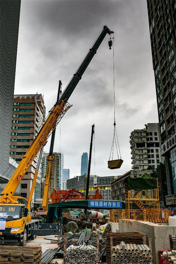我們?cè)谧鳛楫?dāng)下施工主戰(zhàn)場(chǎng)的2號(hào)工點(diǎn)地面東邊施工現(xiàn)場(chǎng)看到,沒(méi)有明顯標(biāo)識(shí)卻能一眼分辨的“迷你”鋼筋加工場(chǎng)里,7、8名穿著“鋼筋工”馬甲的工人,或給鋼筋套絲,或彎制鋼筋構(gòu)件,或忙著調(diào)運(yùn)鋼筋捆……忙而不亂;在西邊,一臺(tái)抓斗機(jī)把土方從基坑里提出來(lái)放入旁邊的鐵鐵質(zhì)料斗箱里,一臺(tái)挖掘機(jī)又將箱里的土轉(zhuǎn)倒裝在運(yùn)土車(chē)?yán)?,土裝滿后鏟斗又將土壓實(shí)、將車(chē)幫上緣的土刮干凈,防止土在運(yùn)輸中掉落……