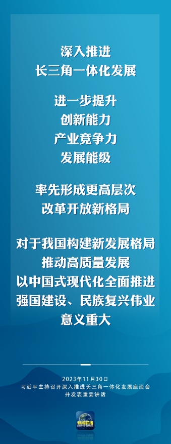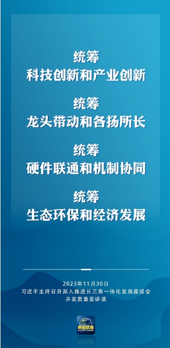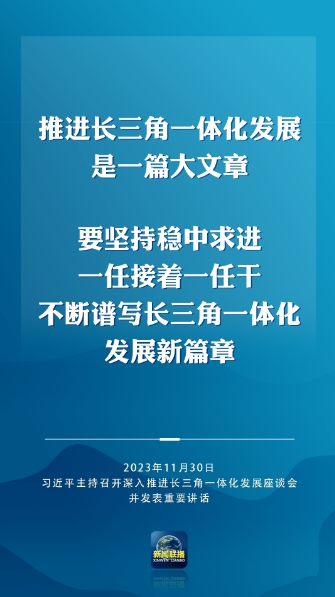習(xí)近平強(qiáng)調(diào),要完整、準(zhǔn)確、全面貫徹新發(fā)展理念,緊扣一體化和高質(zhì)量這兩個(gè)關(guān)鍵詞,樹立全球視野和戰(zhàn)略思維,堅(jiān)定不移深化改革、擴(kuò)大高水平開放,統(tǒng)籌科技創(chuàng)新和產(chǎn)業(yè)創(chuàng)新,統(tǒng)籌龍頭帶動(dòng)和各揚(yáng)所長(zhǎng),統(tǒng)籌硬件聯(lián)通和機(jī)制協(xié)同,統(tǒng)籌生態(tài)環(huán)保和經(jīng)濟(jì)發(fā)展,在推進(jìn)共同富裕上先行示范,在建設(shè)中華民族現(xiàn)代文明上積極探索,推動(dòng)長(zhǎng)三角一體化發(fā)展取得新的重大突破,在中國(guó)式現(xiàn)代化中走在前列,更好發(fā)揮先行探路、引領(lǐng)示范、輻射帶動(dòng)作用。