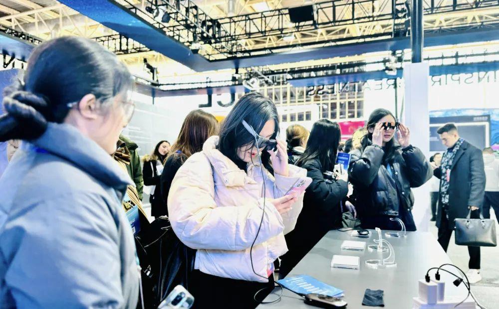 △鏈博會(huì)數(shù)字科技鏈展館一展位前,觀眾正在試戴AR眼鏡。