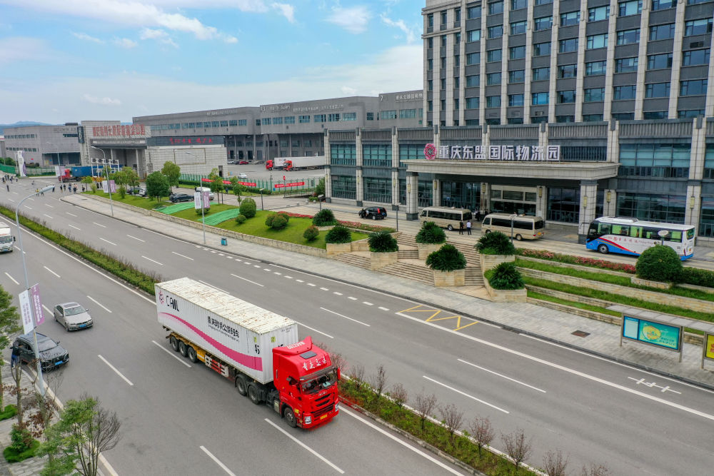 2023年10月11日,滿載筆記本電腦配件、發(fā)電機組件等產品的西部陸海新通道跨境公路班車從重慶南彭公路保稅物流中心駛出,將途經廣西憑祥,直達越南(無人機照片)。新華社記者 黃偉 攝
