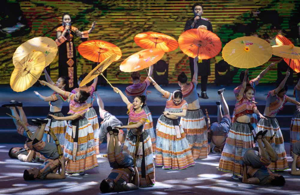 2023年1月18日,以“同心筑厚誼 攜手共發(fā)展”為主題的2023年中越跨國春節(jié)聯(lián)歡晚會在云南省紅河哈尼族彝族自治州河口瑤族自治縣舉行,越南老街省民族藝術歌舞團的演員在晚會上表演歌舞《漂浮在云端的節(jié)日》。新華社記者 胡超 攝