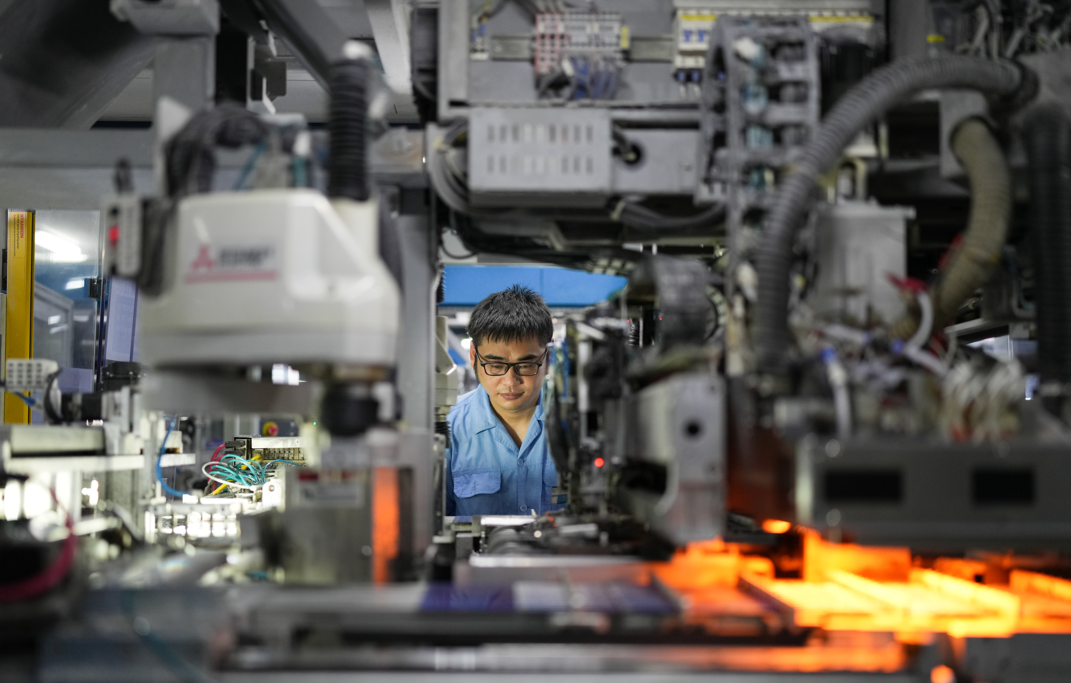 2023年8月9日,在浙江省臺(tái)州市黃巖區(qū)省級(jí)專精特新“小巨人”企業(yè)浙江公元新能源科技股份有限公司,工作人員操作全自動(dòng)焊接機(jī)生產(chǎn)太陽(yáng)能電池片。新華社記者 翁忻旸 攝