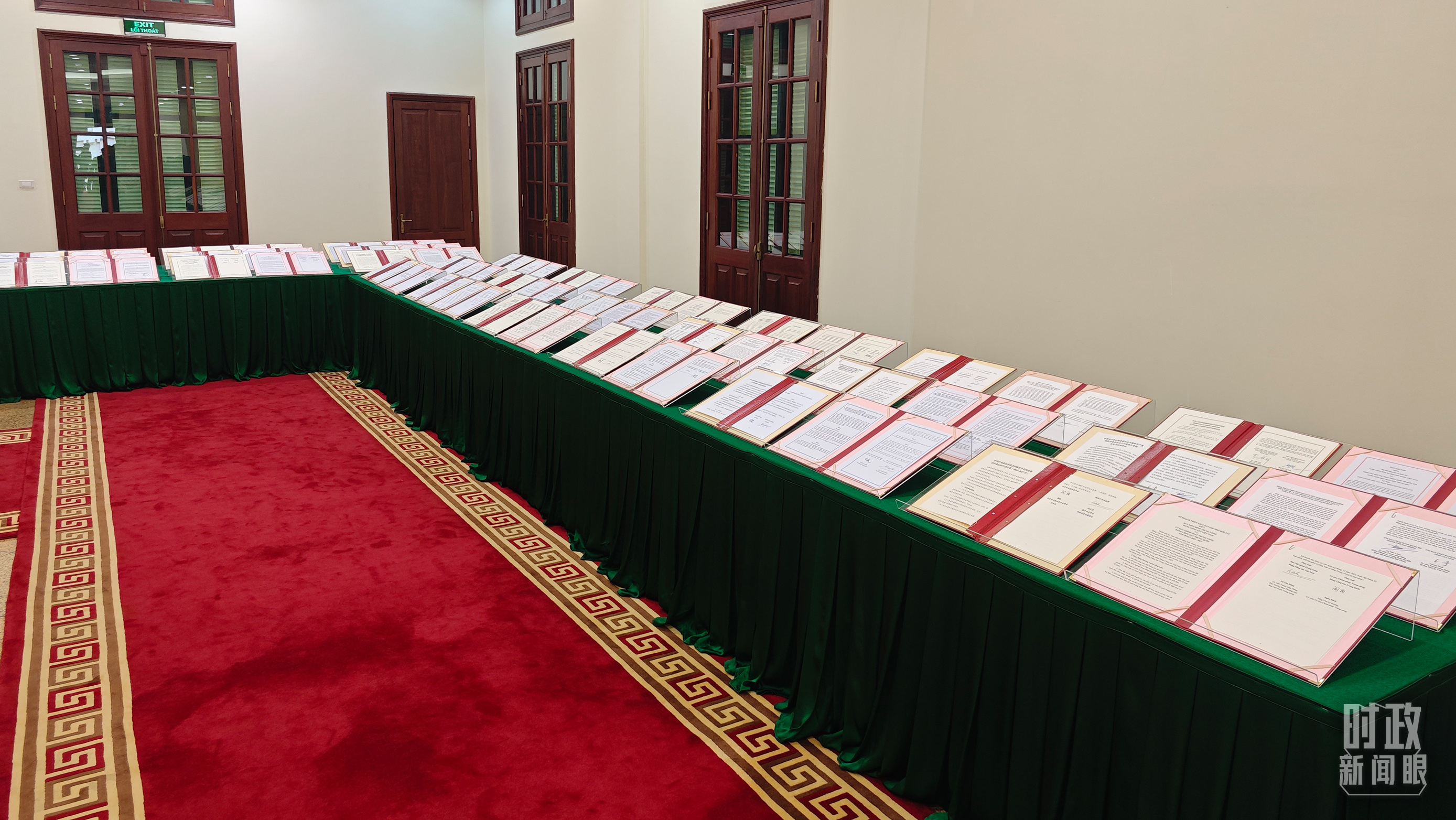 △會(huì)談后,兩黨總書記共同見證雙方簽署的雙邊合作文件展示,涵蓋共建“一帶一路”等30多個(gè)領(lǐng)域。(總臺(tái)央視記者耿小龍拍攝)