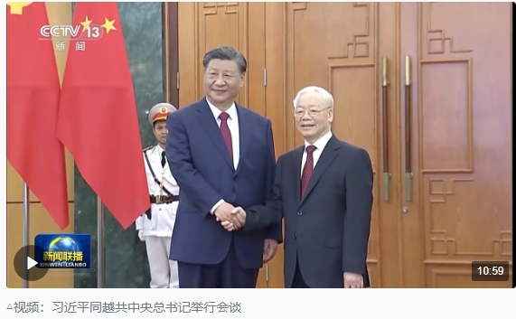 12月12日下午,越共中央駐地。越共中央總書記阮富仲在會(huì)談時(shí)說,“相信習(xí)近平總書記、國(guó)家主席這次訪問必將成為推動(dòng)越中關(guān)系更上一層樓的歷史里程碑”。