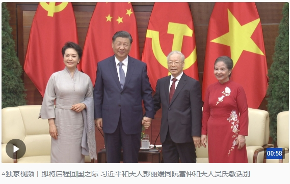12月13日下午,在結(jié)束對(duì)越南進(jìn)行國(guó)事訪問即將啟程回國(guó)之際,習(xí)近平夫婦同越共中央總書記阮富仲夫婦話別。一段對(duì)話,余韻悠長(zhǎng)。