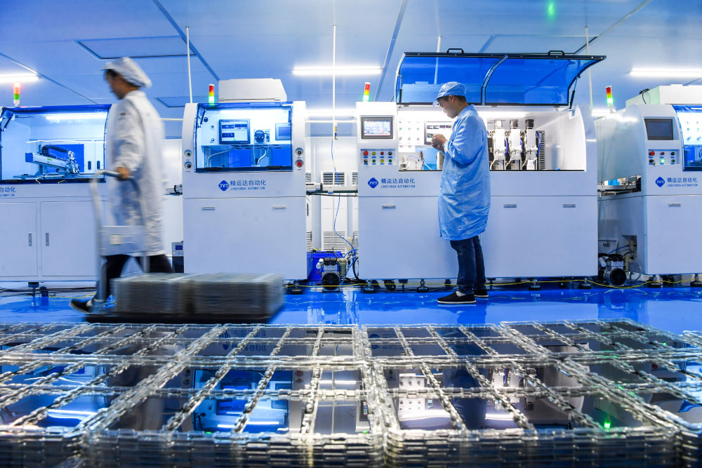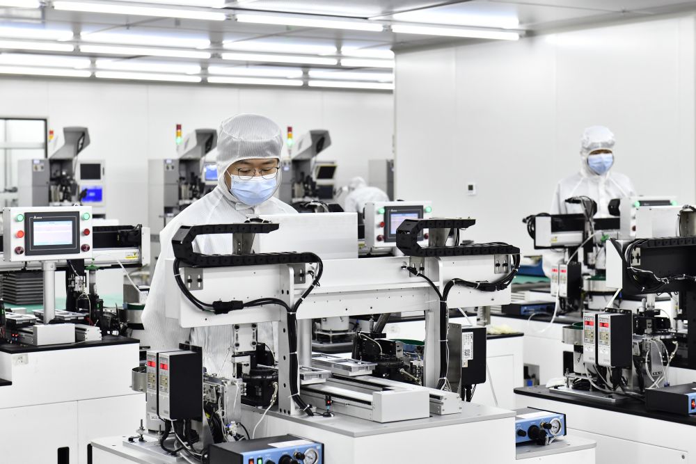 2023年6月29日,在山東省日照高新技術(shù)產(chǎn)業(yè)開發(fā)區(qū)智慧微電產(chǎn)業(yè)園,工作人員在生產(chǎn)濾波器。新華社記者 郭緒雷 攝