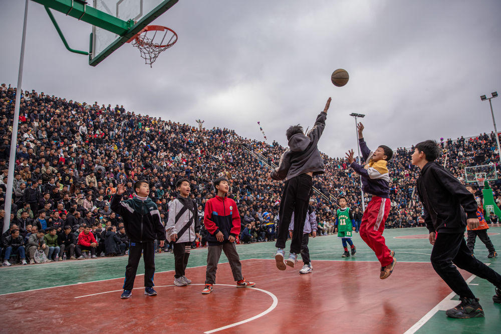 ↑貴州省黔東南州臺江縣臺盤村的小朋友在比賽前打籃球(3月25日攝)。當日,貴州省首屆“美麗鄉(xiāng)村”籃球聯(lián)賽總決賽在臺盤村開打。