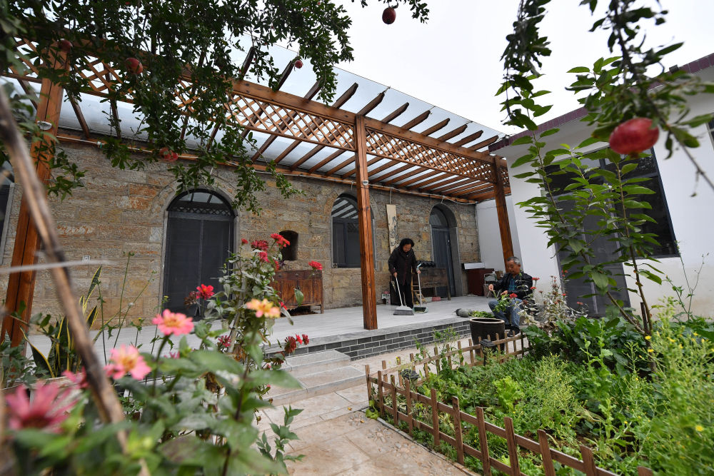 ↑村民在石家莊市鹿泉區(qū)岸下村一處民宿小院收拾家務(10月12日攝)。