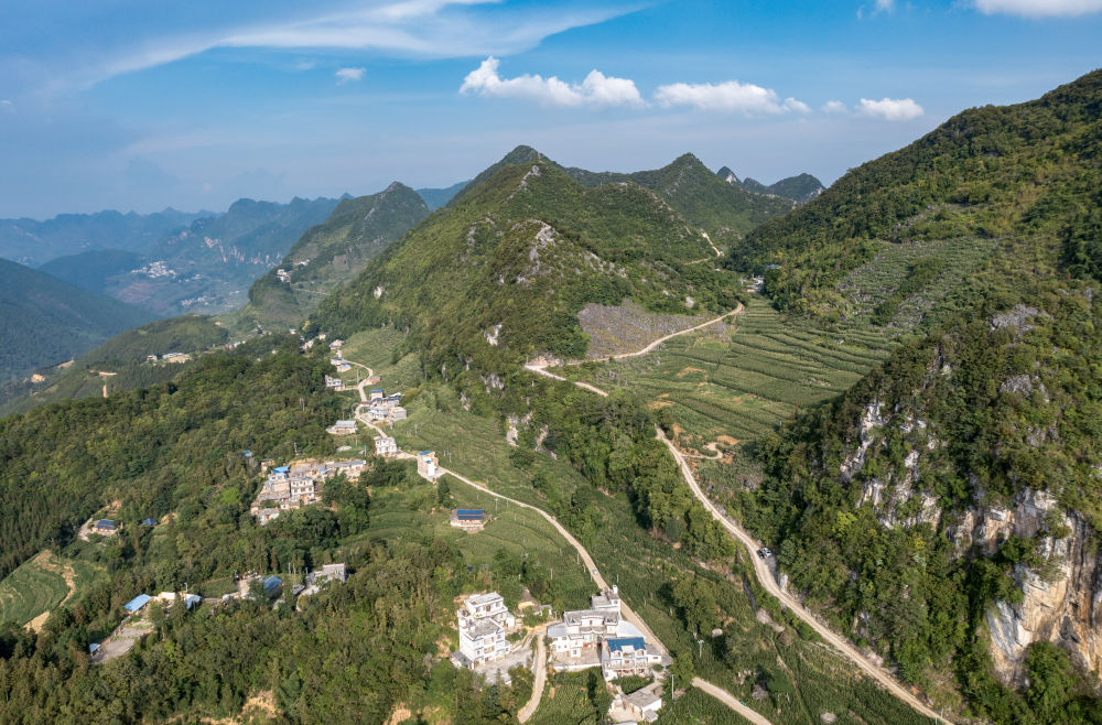 ↑云南省文山壯族苗族自治州西疇縣山間公路,右側(cè)這條是巖頭村村民小組長李華明帶領群眾修建的最后一公里進村道路(無人機照片,7月26日攝)。