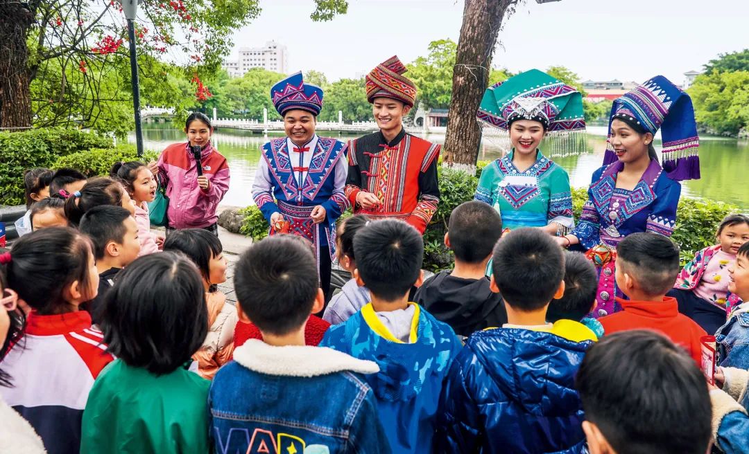 2023年4月25日,廣西桂林,“網(wǎng)絡(luò)法治宣傳一條街”在榕湖景區(qū)古南門“開街”,身穿民族服裝的工作人員演唱山歌向青少年普及網(wǎng)絡(luò)法治知識。