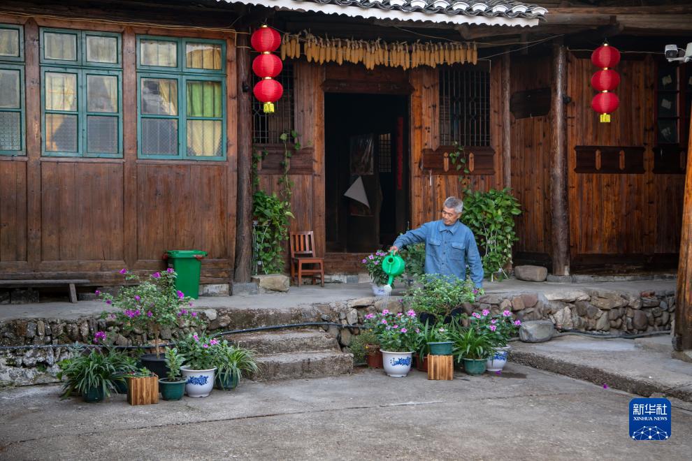 這是湖南省會(huì)同縣堡子鎮(zhèn)黃旗村3組村民唐快生給庭院內(nèi)的綠植澆水(2022年10月5日攝)。新華社發(fā)(張鐳攝)