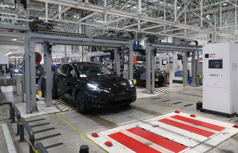 12月22日,在特斯拉上海超級工廠內(nèi),一輛特斯拉電動汽車在進行出廠前的車載電子設(shè)備檢測。新華社記者方喆 攝