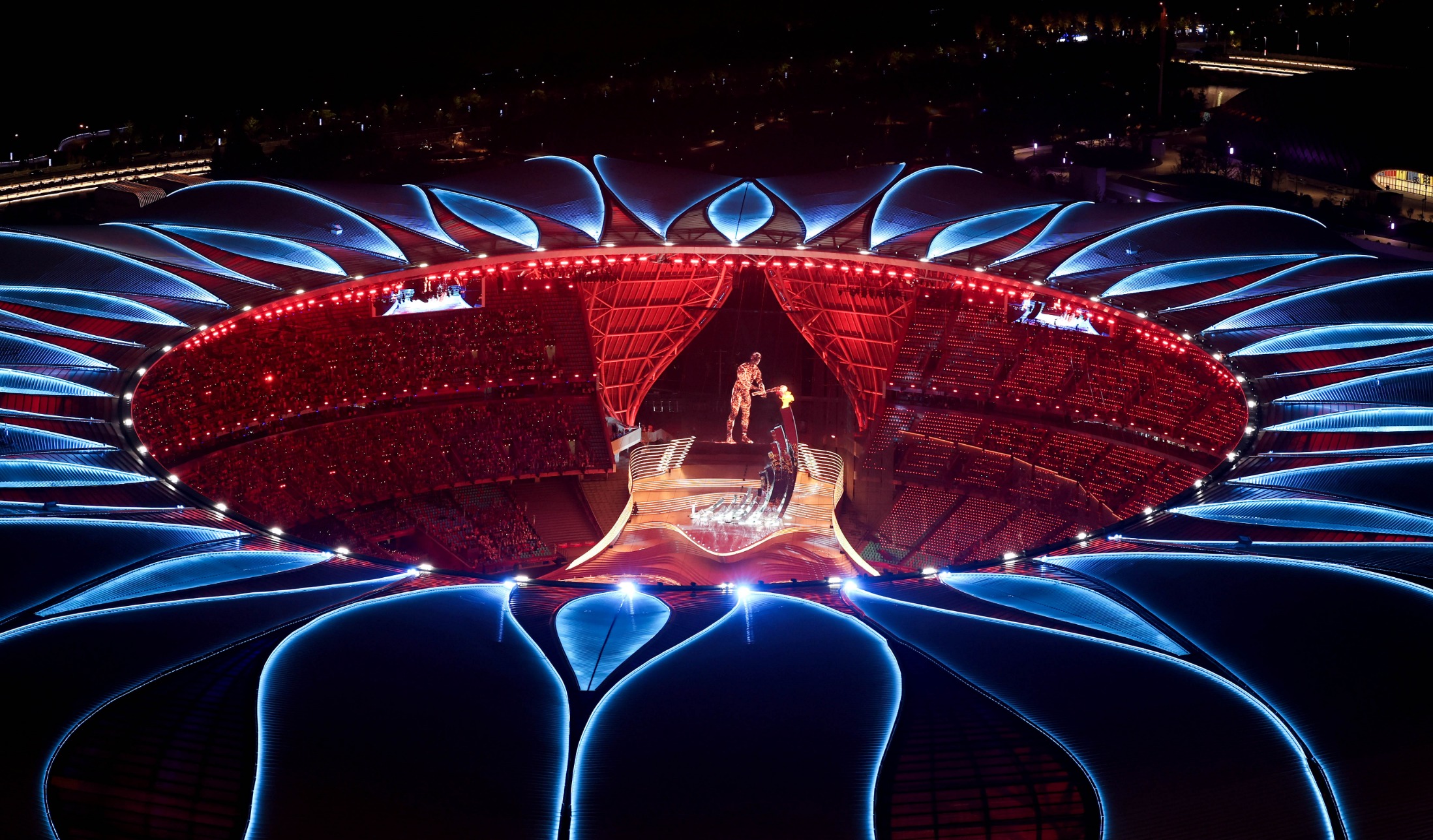 2023年9月23日,最后一棒火炬手汪順和數(shù)字火炬手在杭州亞運會開幕式上點燃主火炬。新華社記者 程婷婷 攝