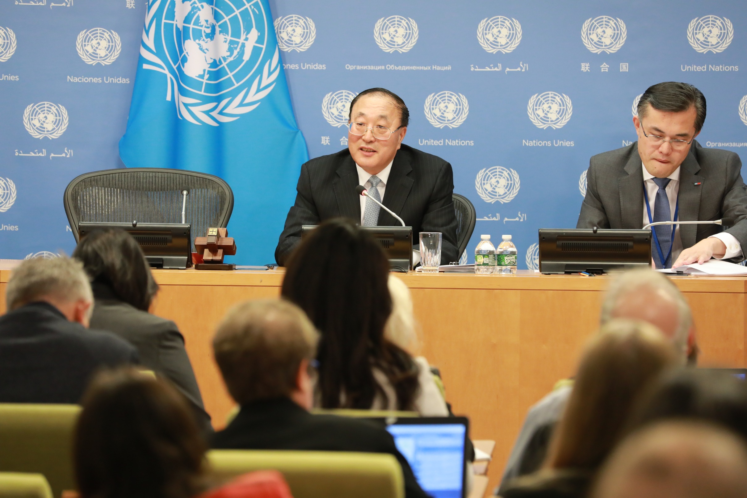 2023年11月1日,在位于紐約的聯(lián)合國總部,中國常駐聯(lián)合國代表張軍(左)在媒體吹風(fēng)會上講話。新華社記者 謝鍔 攝