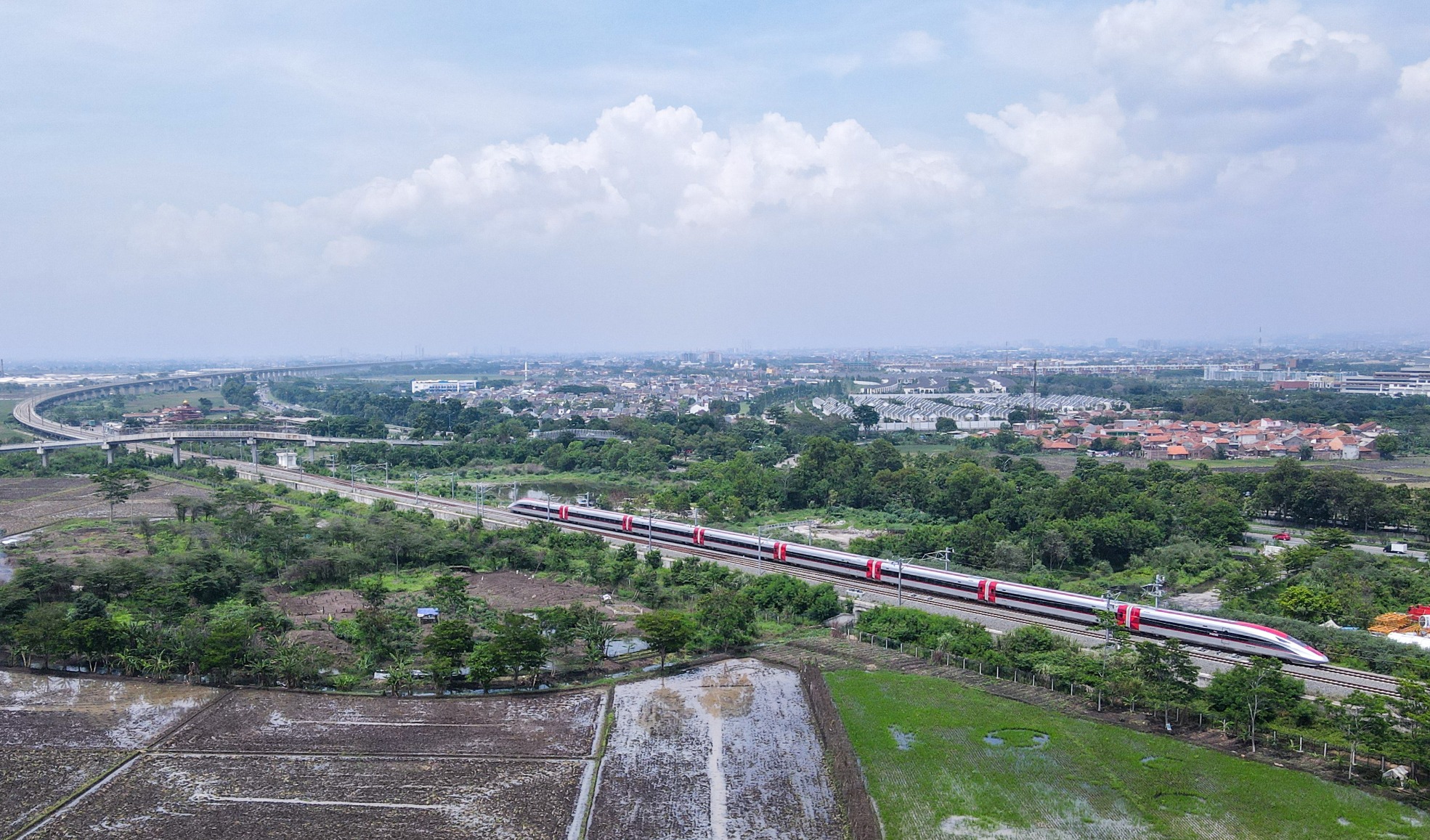 這是2023年12月6日在印度尼西亞萬隆德卡魯爾車站附近拍攝的一列行駛中的雅萬高鐵高速動車組(無人機照片)。新華社記者 徐欽 攝