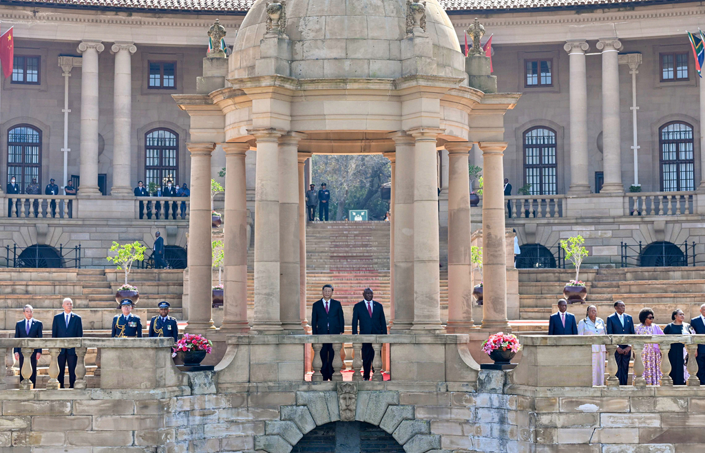 當(dāng)?shù)貢r間2023年8月22日上午,正在南非進(jìn)行國事訪問的國家主席習(xí)近平在比勒陀利亞總統(tǒng)府同南非總統(tǒng)拉馬福薩會談。會談前,拉馬福薩在總統(tǒng)府廣場為習(xí)近平舉行歡迎儀式。