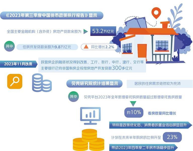從銀行信貸角度看,房地產(chǎn)信貸融資的規(guī)模、結(jié)構(gòu)整體穩(wěn)定。《2023年第三季度中國貨幣政策執(zhí)行報告》顯示,全國主要金融機(jī)構(gòu)(含外資)房地產(chǎn)貸款余額為53.2萬億元,其中,住房開發(fā)貸款余額為9.8萬億元,同比增長2.2%。2023年11月以來,民營房企的融資狀況得到改善,工行、農(nóng)行、中行、建行、交行等主要銀行已向非國有房企投放房地產(chǎn)開發(fā)貸款300多億元。