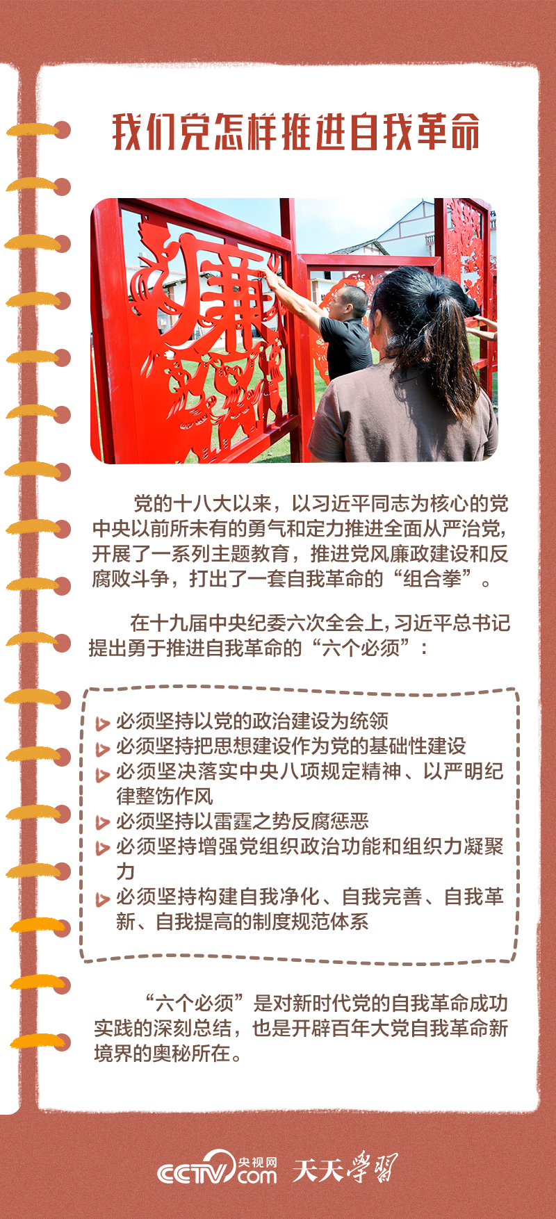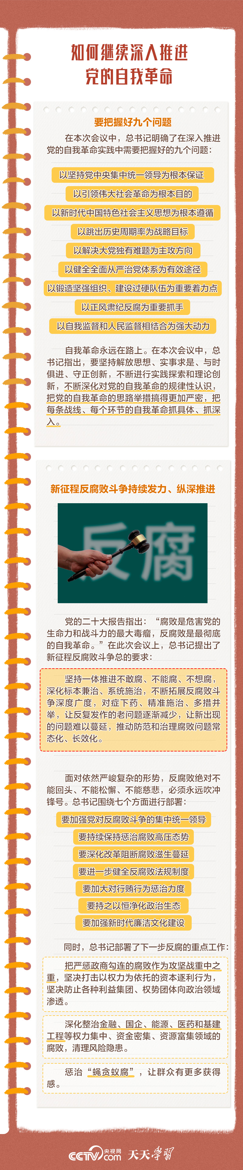 勇于自我革命是我們黨最鮮明的品格和最大的優(yōu)勢(shì),總書記多次對(duì)推進(jìn)黨的自我革命作出重要部署。此次會(huì)議上,總書記深刻闡述了黨的自我革命的重要思想,明確提出需要把握好九個(gè)問題,并對(duì)持續(xù)發(fā)力、縱深推進(jìn)反腐敗斗爭(zhēng)作出戰(zhàn)略部署。央視網(wǎng)《天天學(xué)習(xí)》與您一起學(xué)習(xí)。